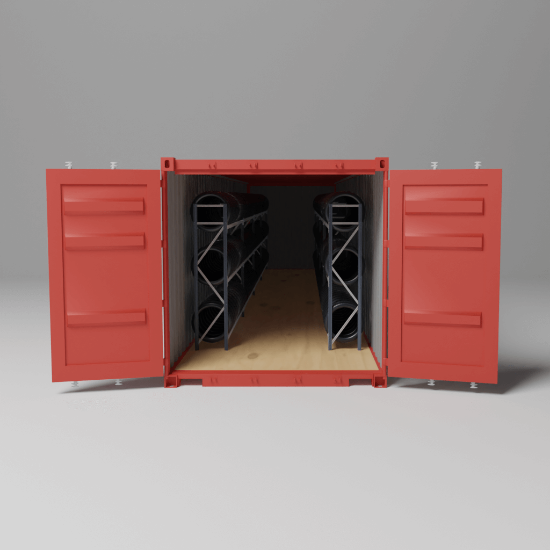 Total længde: 2 x 11080 mm8 x 3 lag, belastning pr. lag max. 750 kgTil opbevaring af ca. 288 dæk/hjulSimpel montageOBS: Container ikke inkluderetProduceret i Europa