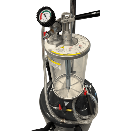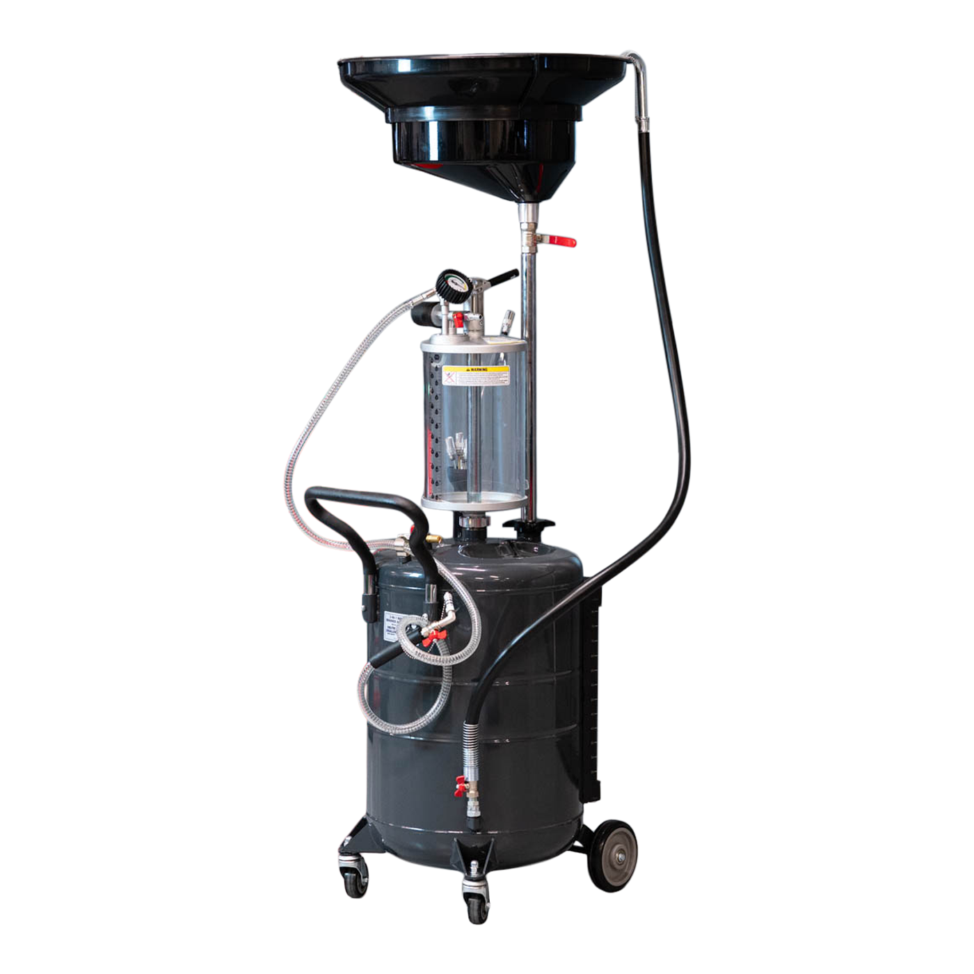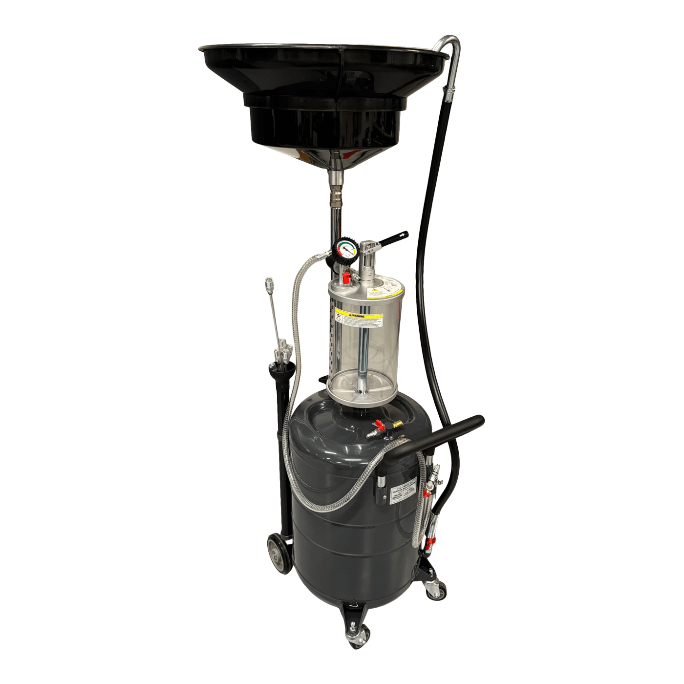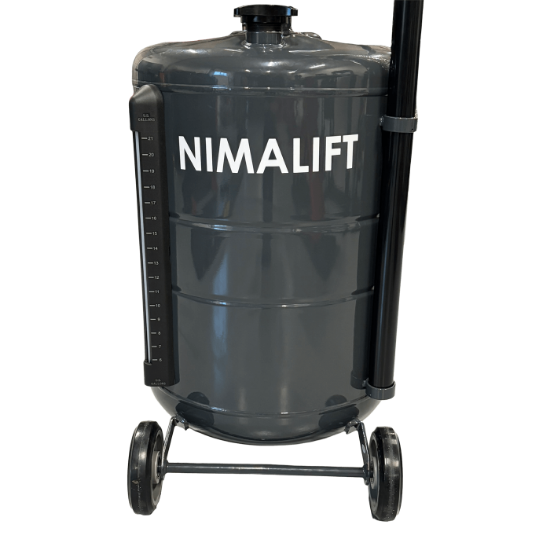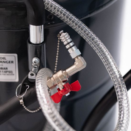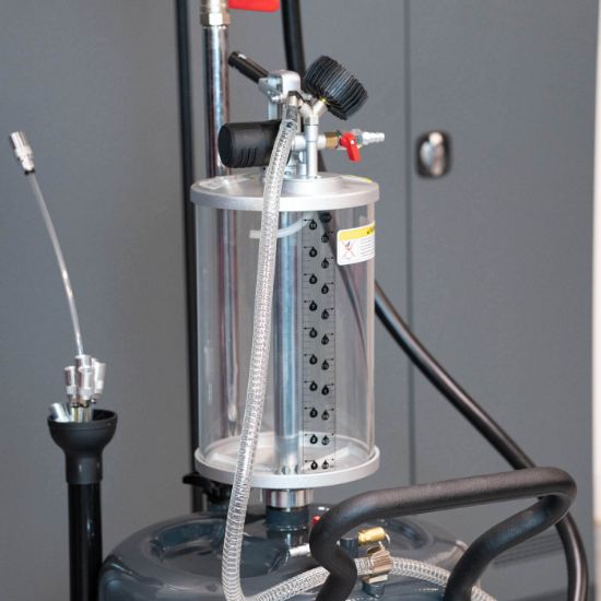 Beholderen er af en størrelse så du ikke skal tømme den efter hver olieskift og når den skal tømmes tilsluttes den blot luft og olien pumpes automatisk ud igen.